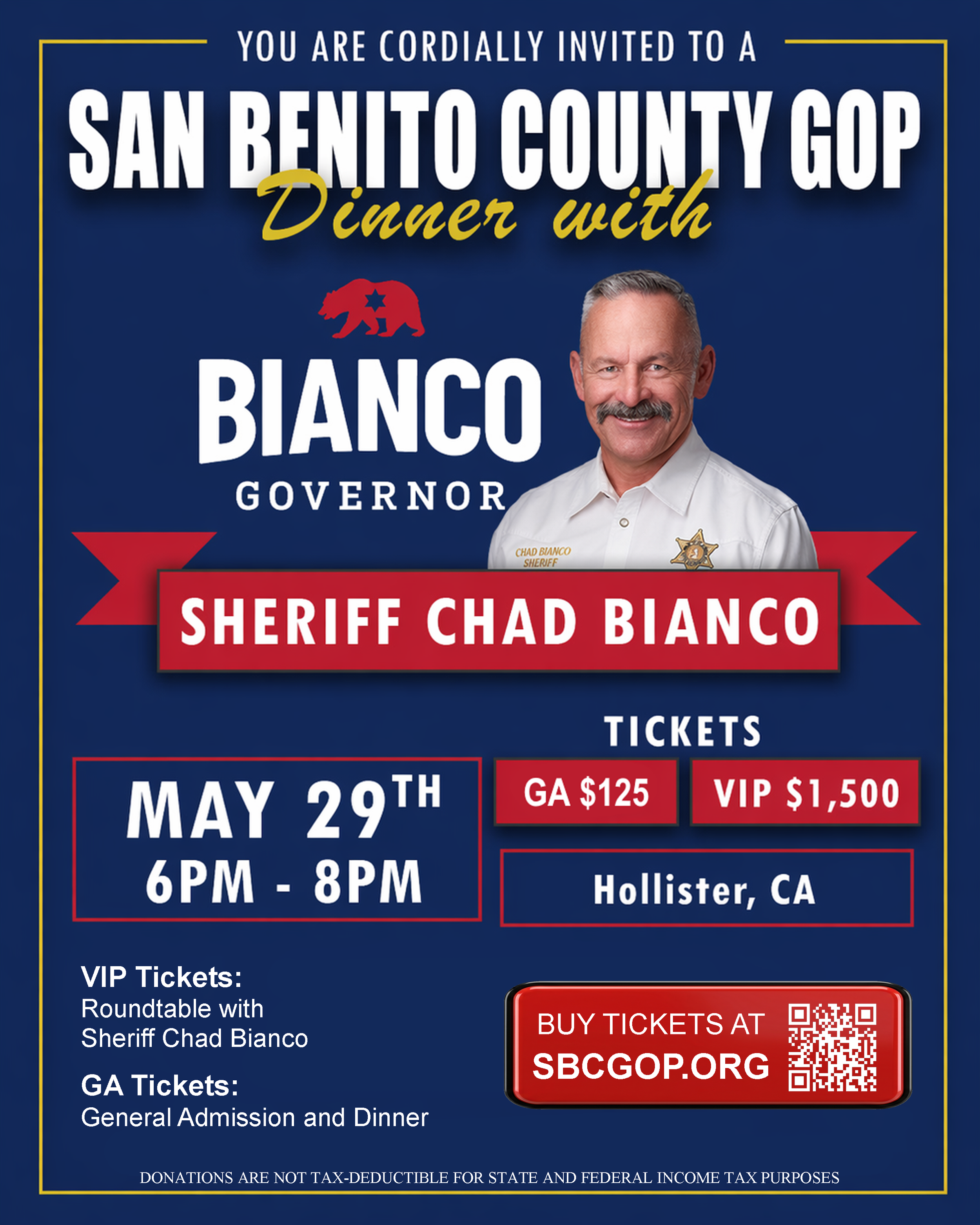 Back to All Events Dinner with Sheriff Chad Bianco Friday, May 29, 2026 6:00 PM 8:00 PM Google Calendar ICS But Tickets NOW! But Tickets NOW!
